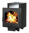 Дровяная печь для бани Везувий Русичъ предназначена для отопления парильного помещения бани или сауны, получения пара и нагрева воды. Максимальная площадь отапливаемого помещения 30 м3. Изготовлена из особо прочной котловой стали марки 09Г2С 6-8мм. Печь топится сухими дровами. Дверца изготовлена из чугуна, со вставкой из стекла. Топочное пространство отделено от дымохода чугунным зубом отбойником. Отбойник помогает перекрыть прямой ход пламени из топки в трубу, тем самым позволяя дровам полностью сгореть. Эта важная деталь задерживает тепло внутри конструкции. Открытая каменка вмещает до 40кг камней, позволяя равномерно распределить температуру в парной. К печи необходимо подключить дымоход диаметром 115мм.